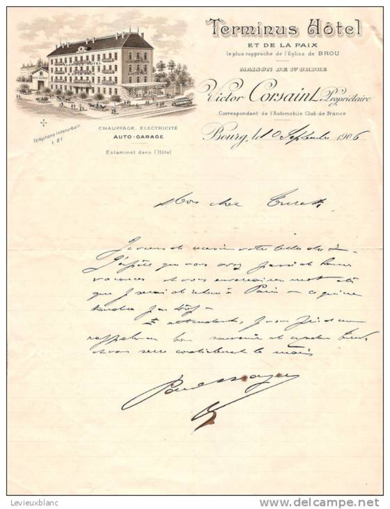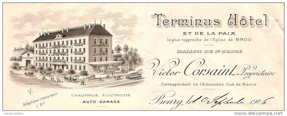 – leteron (je la 10a de septembro 1906) manskribitan de Victor Corsaint, sur leterfronta folio de la hotelo « Hôtel Terminus » (kaj pligrandigon de la leterfronto),