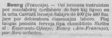 Dungoferto en … Esperanto, venante el la Esperanto-Oficejo de Bourg-en-Bresse ! Kaj, por respondi al tiu dungoferto, bezonas skribi al la Oficejo, por Signoro Urbestro … Jes, ĉar mi forgesis precizigi, antaŭe, ke en Bourg-en-Bresse, ankaŭ la Urbestro … estas eperantisto …