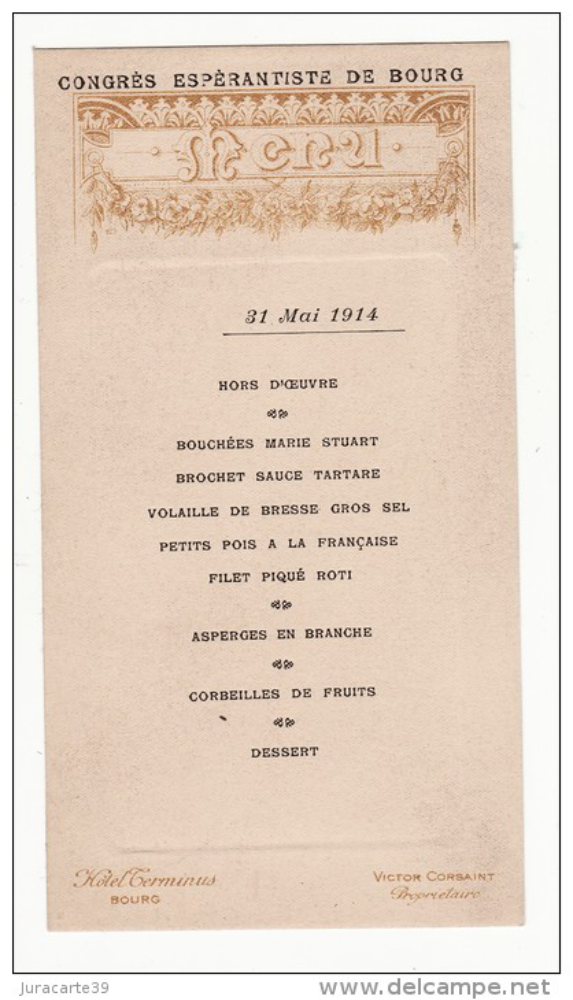 – la menuon de la esperantista kongreso de Bourg-en-Bresse en 1914,… kompreneble en la hotelo « Hôtel Terminus »… (tiam oni ja havis bonan apetiton …)